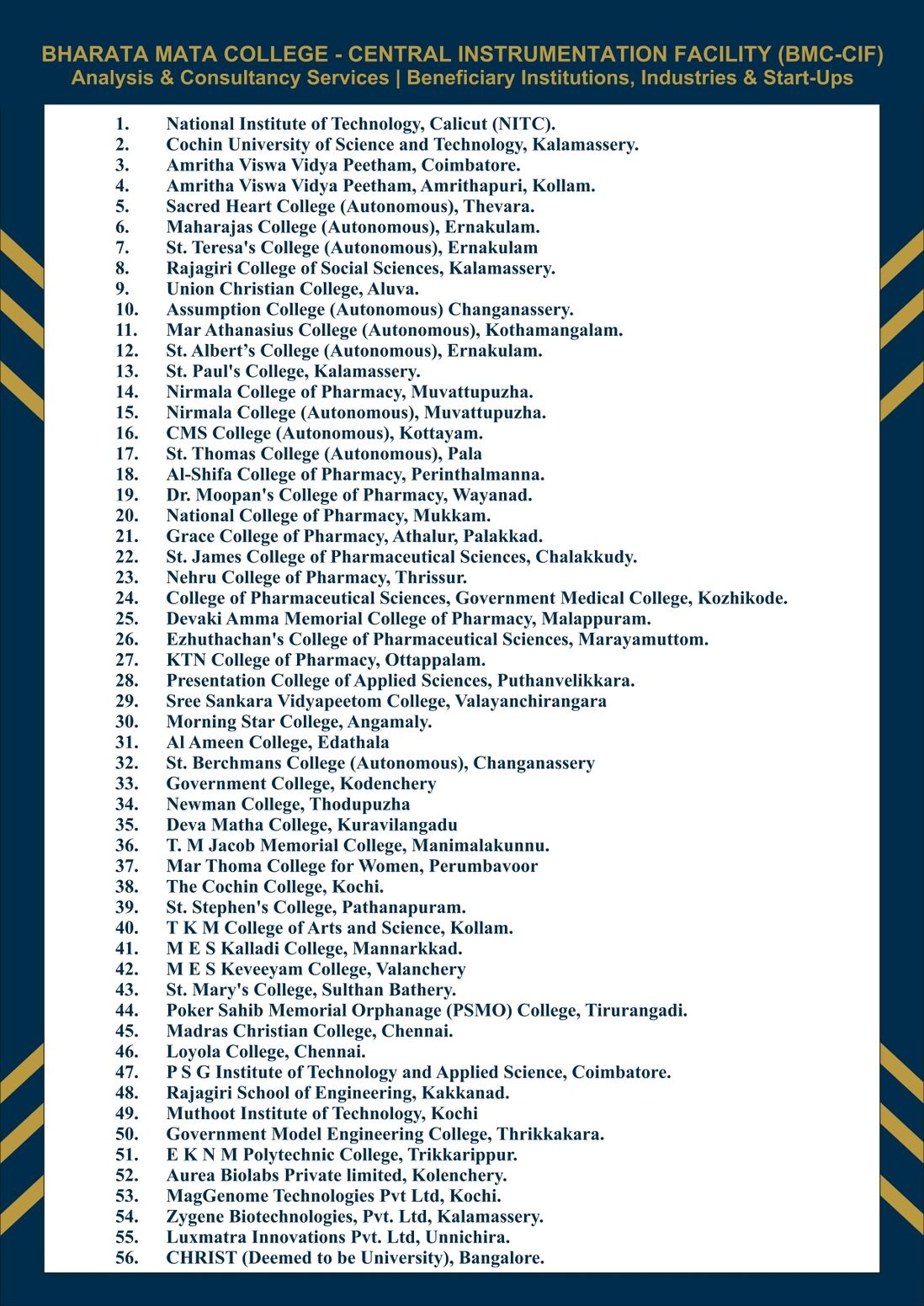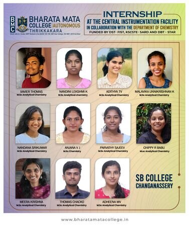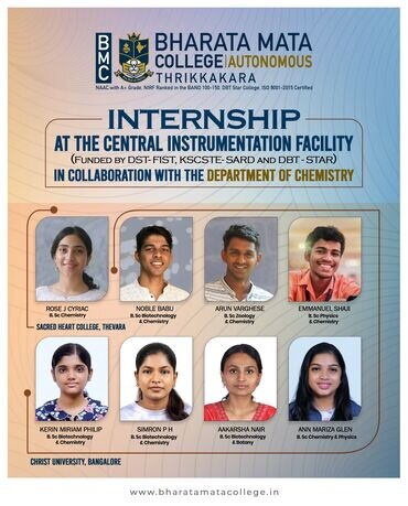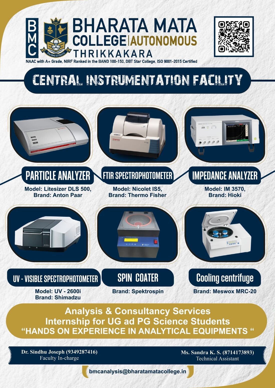 The Central Instrumentation Facility of Bharata Mata College, Thrikkakara is funded by DST- FIST (SR/FIST/College - 313/2016 dt. 08.02.2018), KSCSTE- SARD (23/2019/KSCSTE dt. 04.01.2019), DBT - STAR ( HRD - 11011/22/2022 - HRD - DBT dt. 24.08.2022) and RUSA-SPD No. 149/2019/RUSA-SPD dtd. view video