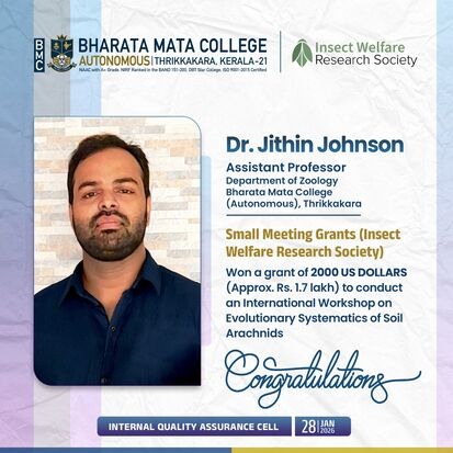 We are immensely proud to announce that Dr. Jithin Johnson, Assistant Professor in the Department of Zoology at Bharata Mata College, has been elected as a Fellow of the Linnean Society (FLS) of London.