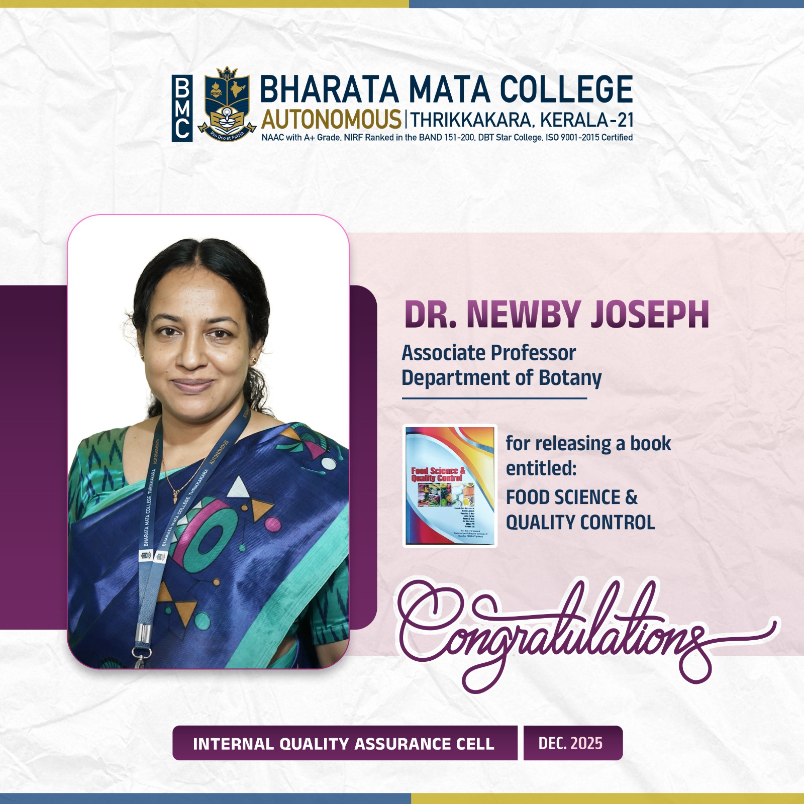 Heartiest congratulations to Dr. Newby Joseph, Associate Professor, Department of Botany, on the release of her book “Food Science & Quality Control.”