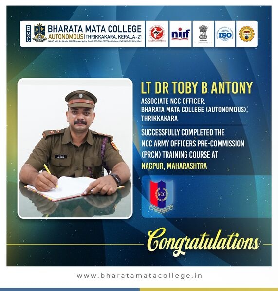Hearty congratulations to Lt Dr Toby B Antony for the successful completion of NCC Army Officers Pre-Commission (PRCN) Training Course at Nagpur, Maharashtra.