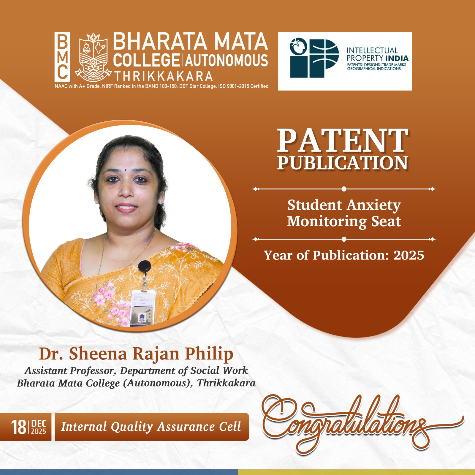 We are delighted to announce that Dr. Sheena Rajan Philip, Assistant Professor in the Department of Social Work at Bharata Mata College (Autonomous), Thrikkakara, has published a significant patent titled "Student Anxiety Monitoring Seat". Congratulations, Dr. Sheena, on this commendable milestone.