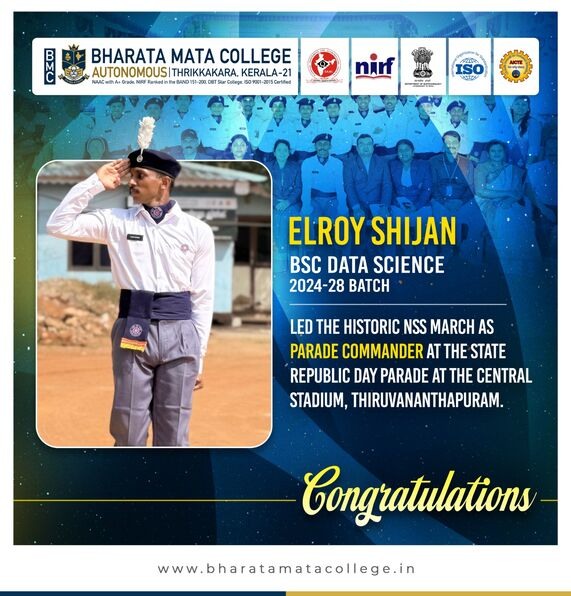 Huge congratulations to Elroy Shijan (BSc Data Science) for making history! Elroy took command as the Parade Commander for the NSS March at the State Republic Day Parade in Thiruvananthapuram.