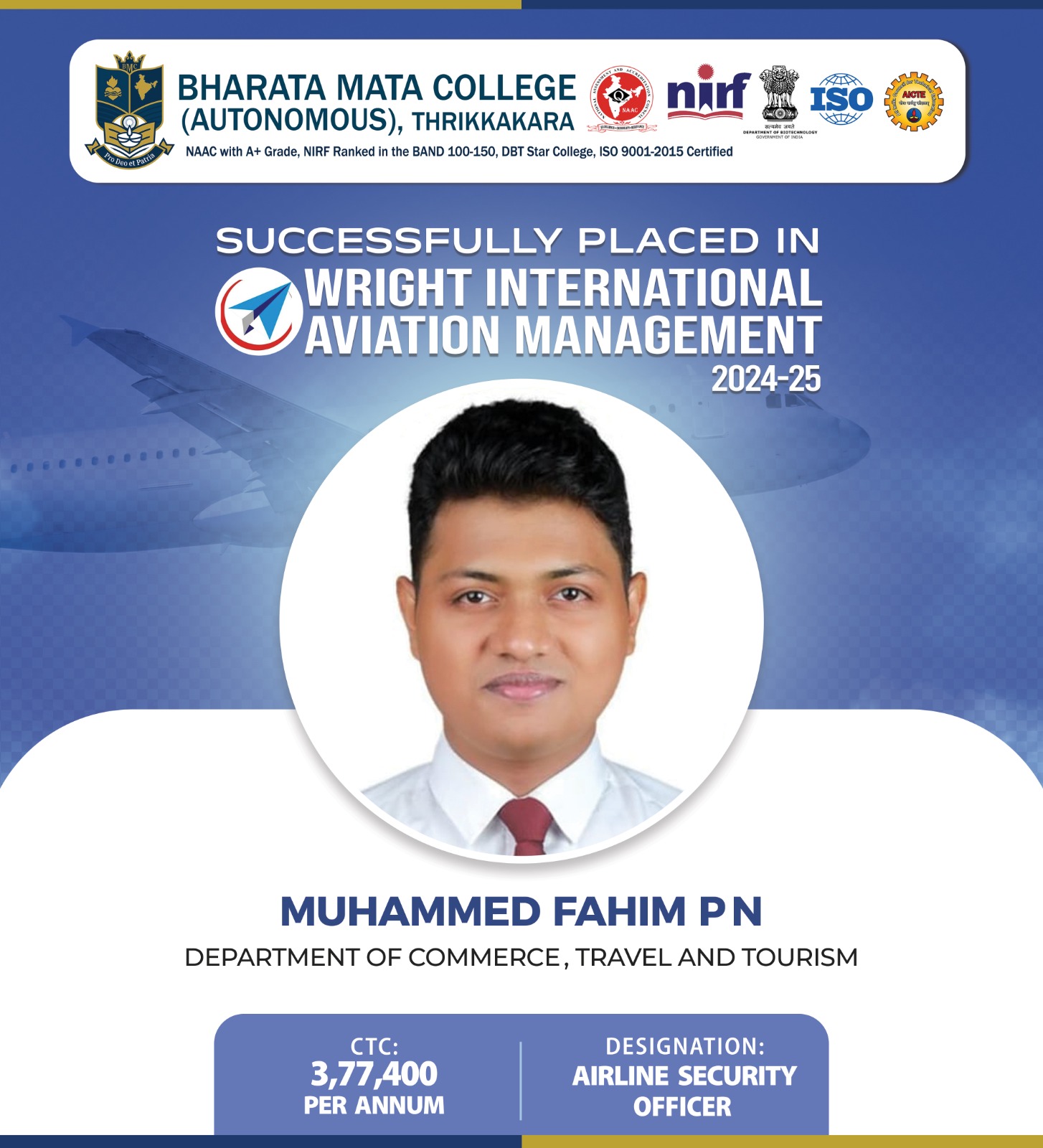 Muhammed Fahim P N of Department of Commerce, Travel and Tourism has Successfully placed in Wright International Aviation Management 2024-2025 as Airline Security Officer