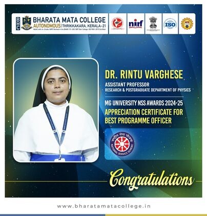 We are immensely proud to announce that Dr. Rintu Varghese, Assistant Professor in the Research & Postgraduate Department of Physics has been honored with the MG University NSS Appreciation Certificate for Best Programme Officer (2024-25).